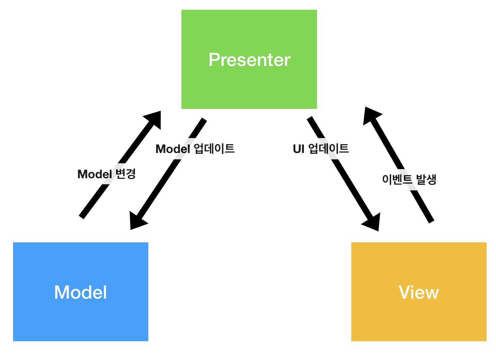 - 뷰는 사용자 이벤트를 프레젠터에게 전달하고, 프레젠터는 데이터(모델)를 업데이트(저장/수정/삭제)한다.