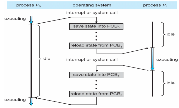추후 복원될 P0을 위해 해당 프로세스 정보를 PCB에 담아 저장한다. P1은 이전에 저장한 PCB로 부터 상태를 복원하여 작업을 계속 수행한다. P1도 어느 시점이 되면 다시 Ready 상태가 되어 PCB에 상태를 담아 저장하고, P0이 PCB로 부터 복원되어 작업을 계속 수행할 것이다.