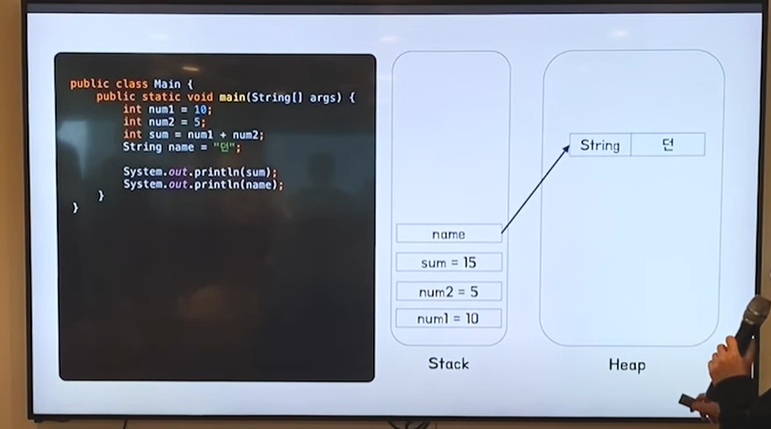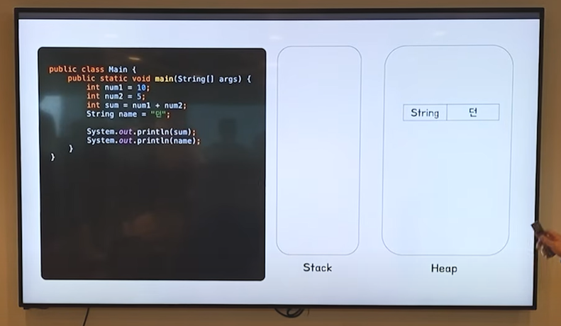 main() 메서드가 실행될때 a, b, sum 변수는 스택메모리에 할당이됩니다. text의 참조값도 스택매모리에 할당됩니다.